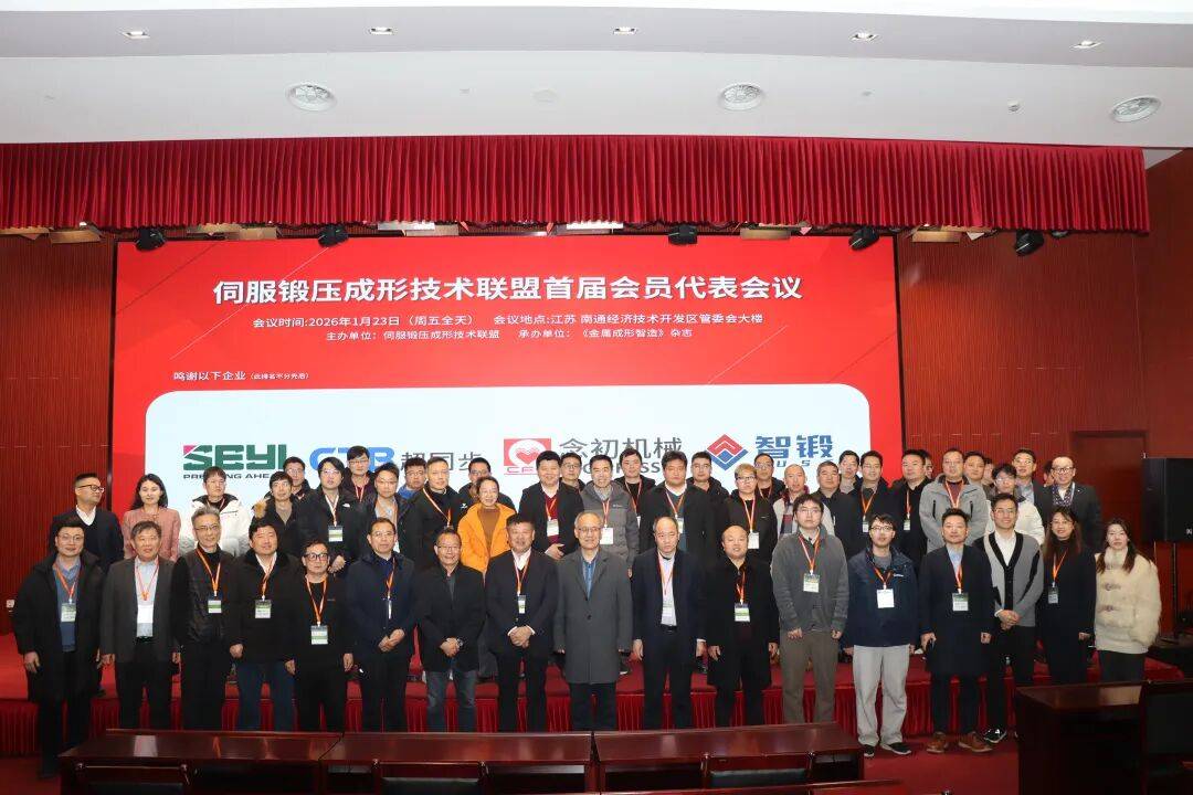 2026 年 1 月 23 日,伺服锻压成形技术联盟首届会员代表会议在江苏南通经济技术开发区能达大厦成功召开。本次会议由伺服锻压成形技术联盟主办、《金属成形智造》杂志承办,金属成形技术与重型装备全国重点实验室协办,伺服锻压成形领域的企业代表、科研专家、高校学者等各界人士齐聚一堂,以“凝聚行业力量,推动技术创新” 为核心,共商联盟发展大计,见证行业发展新起点。